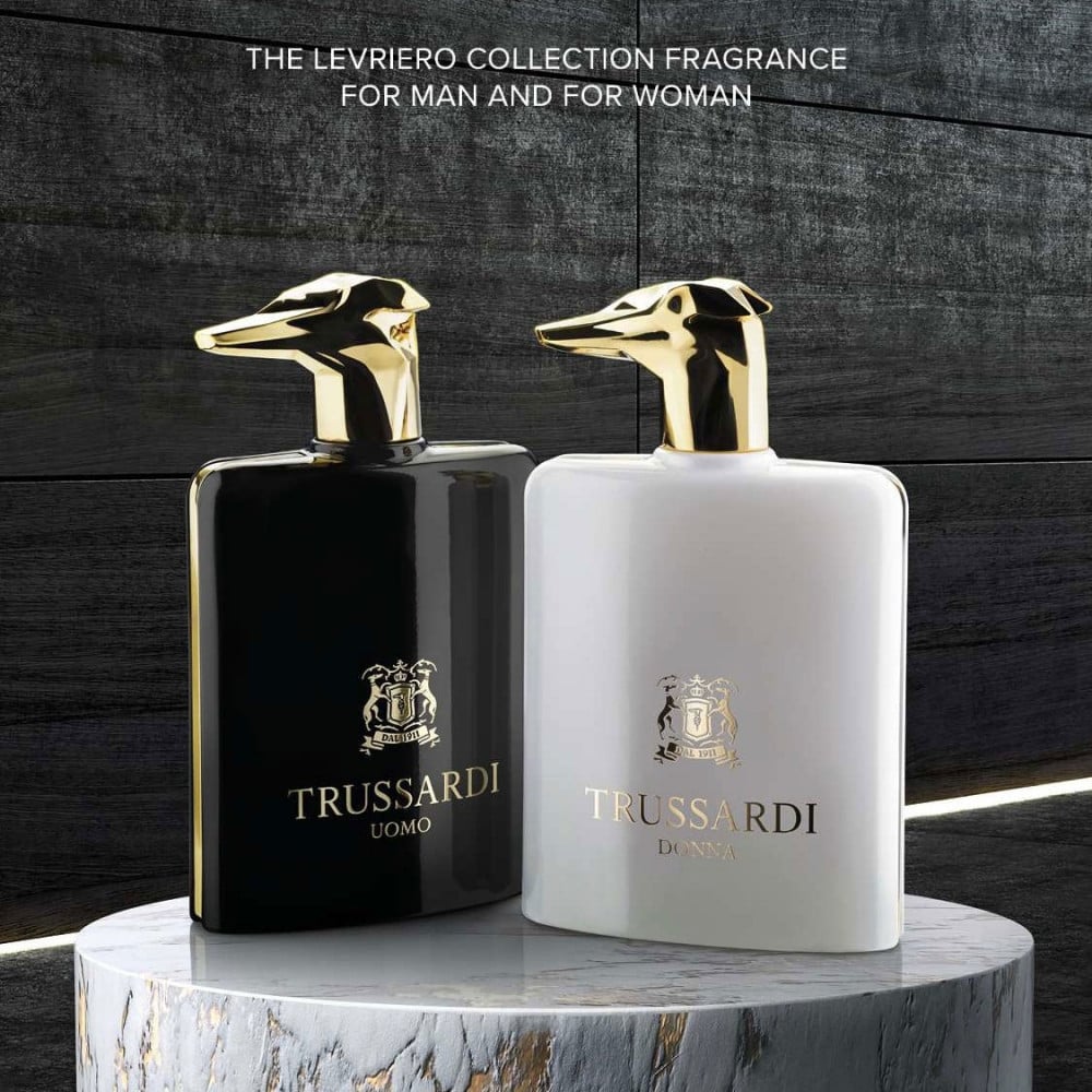 Envolto em uma elegante garrafa preta, com um boné Levriero dourado, o novo perfume Trussardi Uomo presta homenagem à virilidade masculina e elegância, lançando as notas cítricas de limão e bergamota. A noz-moscada, combinada com um toque de galbanum, introduz a mistura de violeta e gerânio. Misteriosa e fascinante, a fragrância amolece em toques de sálvia e patchouli, aumentando o calor e o fascínio das últimas notas de akigalawood e sândalo. Luxuoso e incomparável: este é o segredo do homem neoclássico Trussardi.